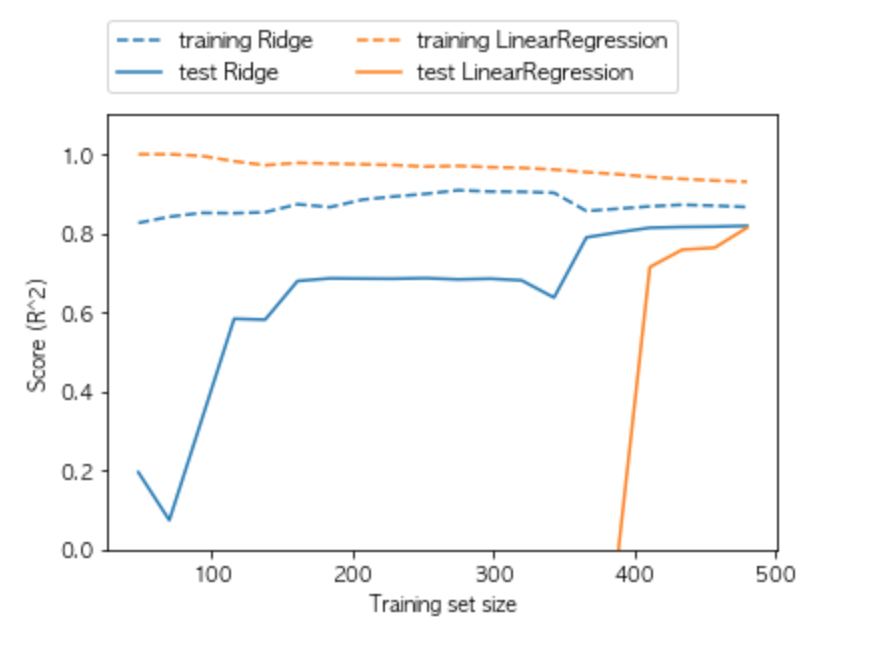 즉 두 모델의 성능은 ( 테스트 데이터세트의 결과 ) 데이터가 많으면 많을수록 좋아지며, 마지막에는 선형 회귀가 릿지 회귀의 테스트 점수를 따라잡는 것이 확인됩니다.