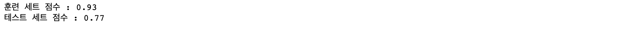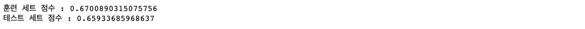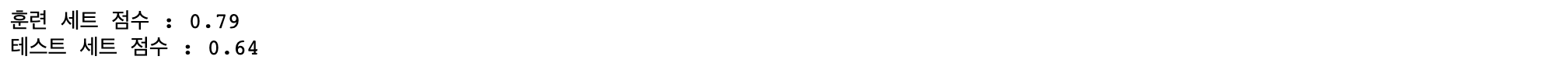 print("테스트 세트 점수 : {:.2f}".format(ridge01.score(X_test, y_test)))