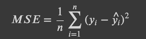 위의 수식이 조금 불편 하긴 하지만 사실 MSE는 모델이 예측한 예측값( 𝑦𝑖^ )과 훈련 세트로 인해 훈련된 값 타깃값( 𝑦𝑖 )의 차이를 제곱하여 더한 후에 평균을 구한 것이라고 보면 됩니다. ( 샘플의 개수로 나눈 것 )