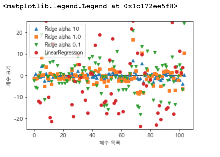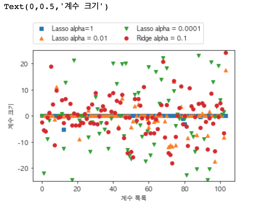 alpha 값이 0인 ( 규제가 전혀 없는 ) LinearRegression 같은 경우는 그래프를 벗어나는 특성도 존재하는 것을 확인해 볼 수 있습니다.