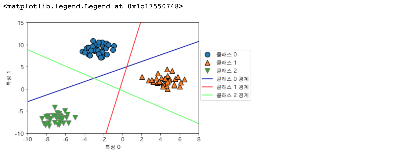 coef_ 배열의 크기는 (3,2)입니다. coef_의 행은 세 개의 클래스가 각각 대응하는 계수 벡터들을 각각 담고 있으며, 열은 각 특성에 따른 계수 값을 가지고 있습니다. intercept_는 각 클래스의 절편을 담아낸 1차원 벡터입니다.
