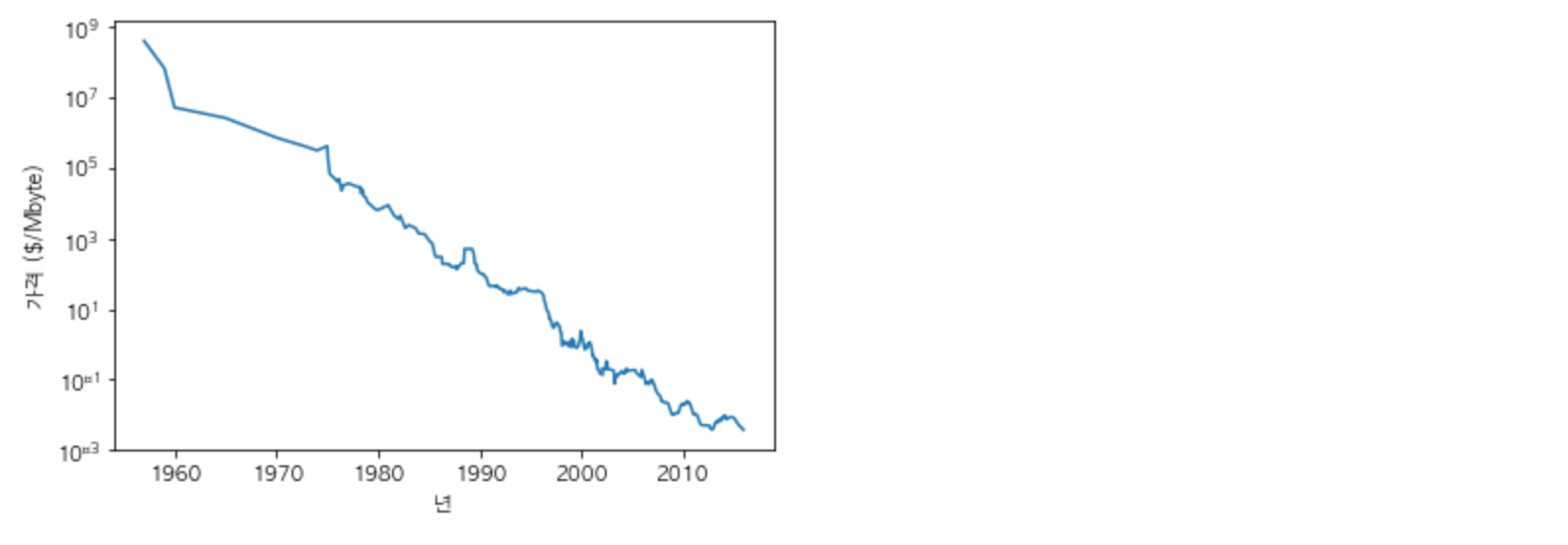 plt.ylabel("가격 ($/Mbyte)")