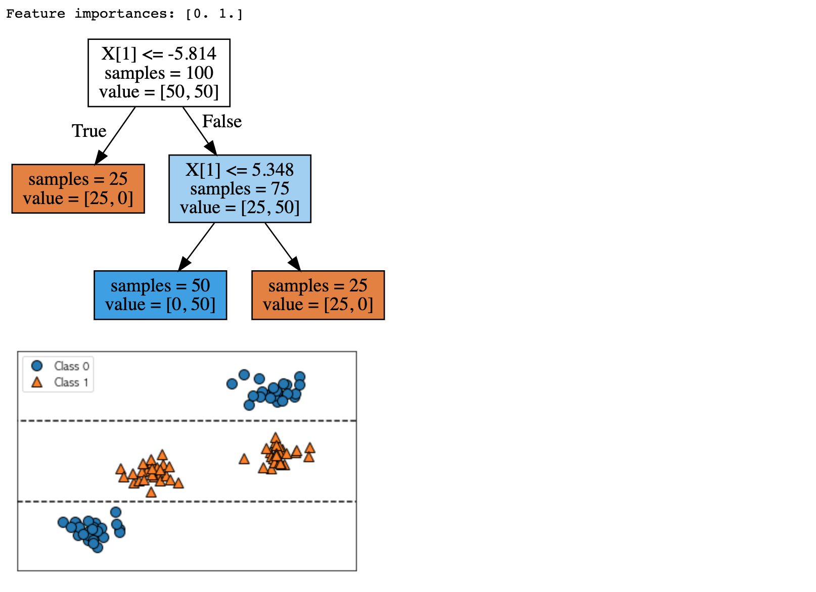 두 개의 특성과 두 개의 클래스를 가진 데이터셋을 표현하고 있습니다. X [1]에 있는 정보만 사용되었고, X [0]은 전혀 사용되지 않았습니다. 그런데 X [1]과 출력 클래스와의 관계는 단순히 비례나 반비례하지 않습니다. 즉 "X [1]의 값이 높으면 클래스 0이고 값이 낮으면 1"이라고 말할 수 없습니다.