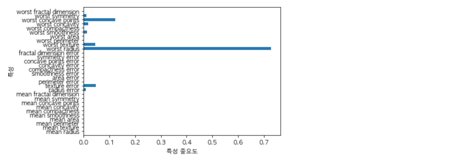 첫 번째 노드에서 사용한 특성인 worst radius 가 가장 중요한 특성으로 나타나는 것이 확인됩니다. 이 그래프는 첫 번째 노드에서 두 클래스( 악성, 양성 )를 꽤나 잘 나누고 있다는 것을 의미합니다.