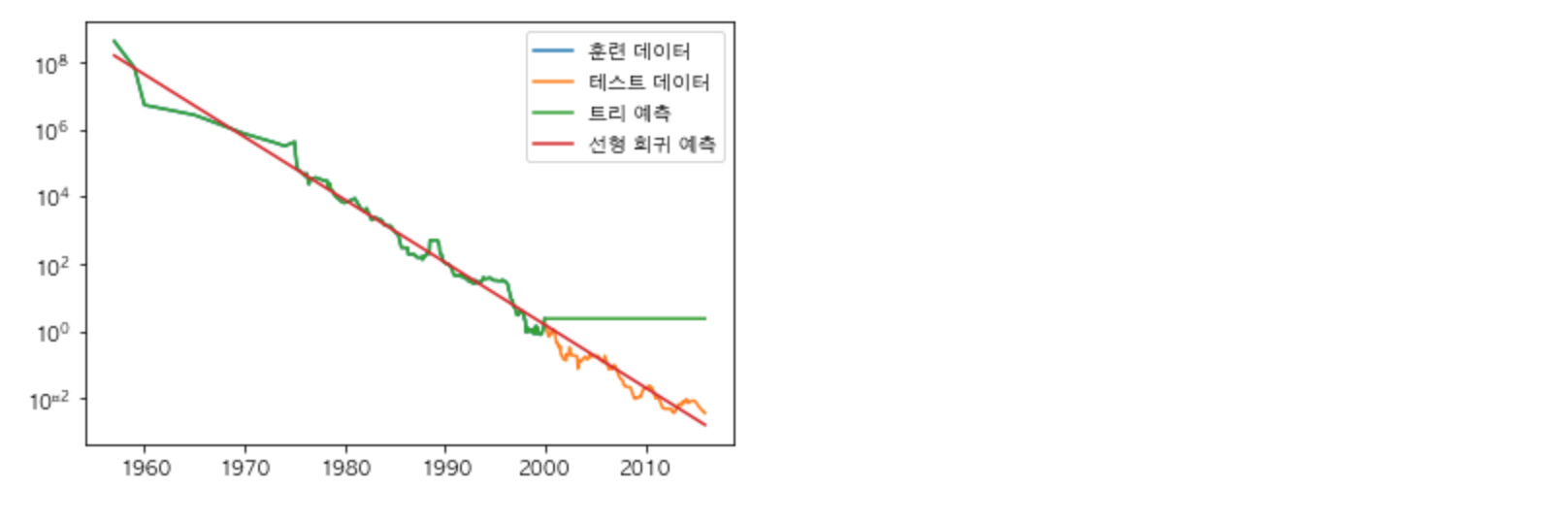 y축은 로그 스케일로써 선형적으로 그리기 좋기 때문에 비교적 예측이 쉬워집니다.