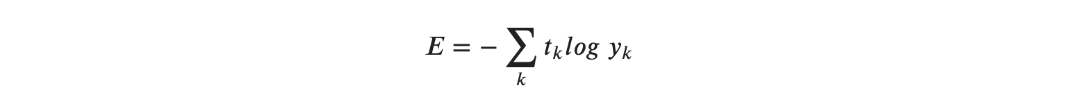 𝑦𝑘는 신경망의 출력, 𝑡𝑘는 정답 레이블입니다. 𝑡𝑘는 정답에 해당하는 인덱스의 원소만 1이고, 나머지는 0인 One-Hot-Encoding 된 형식의 데이터입니다.