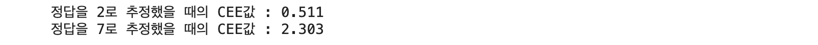 print("정답을 7로 추정했을 때의 CEE값 : {:.3f}".format(cross_entropy_error(np.array(y), np.array(t))))